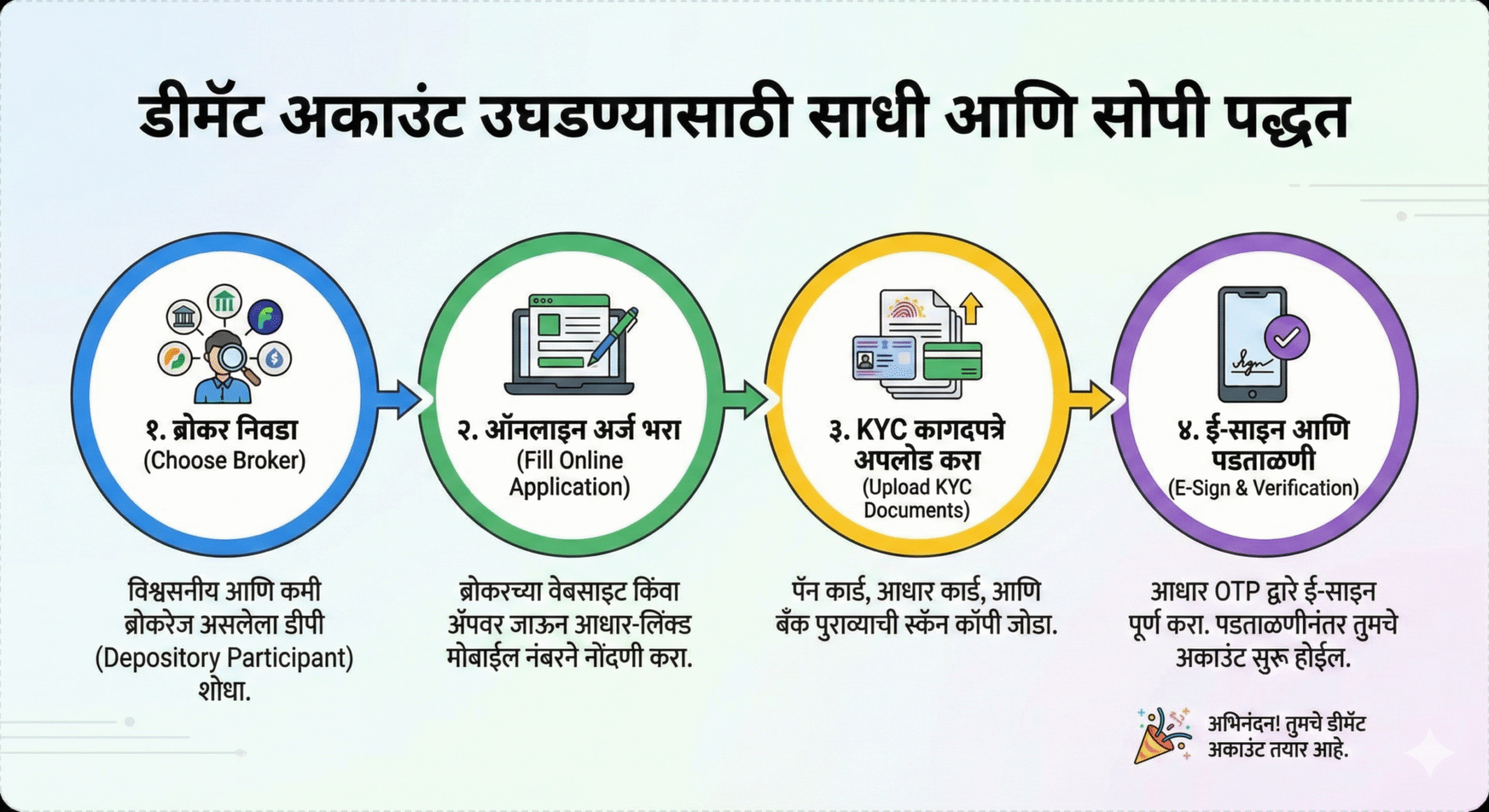 डीमॅट अकाउंट उघडण्याची प्रक्रिया आता पूर्णपणे ऑनलाईन आणि अत्यंत सोपी झाली आहे. तुम्ही घरबसल्या अवघ्या १० ते १५ मिनिटांत हे अकाउंट उघडू शकता.