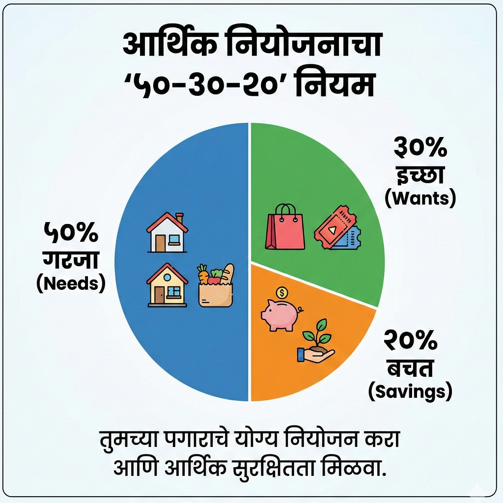 पगाराचे नियोजन करण्यासाठी ‘५०-३०-२०’ नियम (50-30-20 Rule) हा जगातील सर्वात सोपा आणि प्रभावी मार्ग मानला जातो.