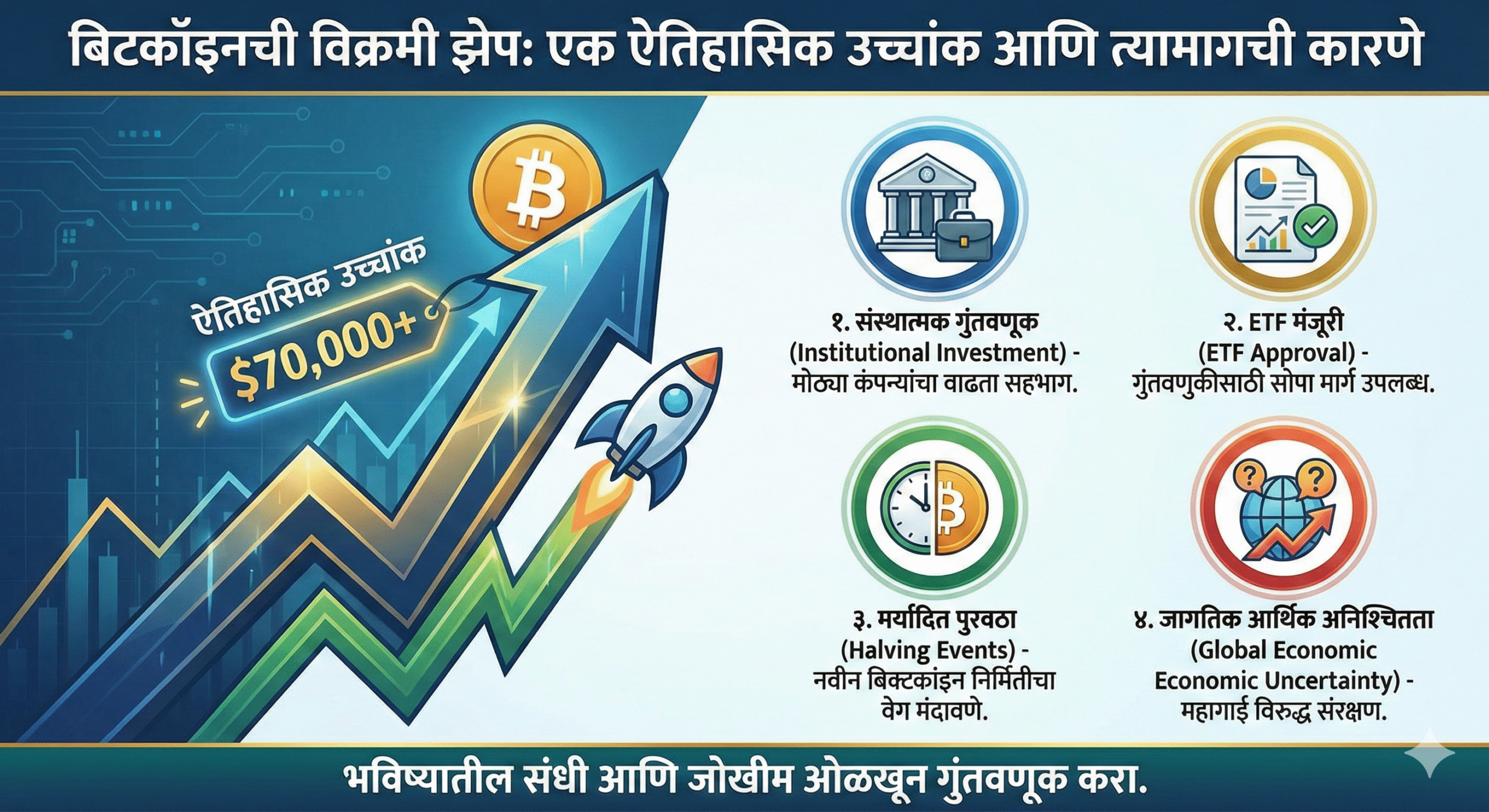 १. ‘विक्रमी झेप’ म्हणजे नक्की काय? जेव्हा बिटकॉइनची एका कॉईनची किंमत (उदा. डॉलरमध्ये) त्याच्या इतिहासातील सर्वोच्च पातळीवर पोहोचते, तेव्हा त्याला ‘विक्रमी झेप’ किंवा ‘All-Time High (ATH)’ म्हटले जाते. याचा अर्थ असा की, यापूर्वी बिटकॉइनची किंमत इतकी जास्त कधीच नव्हती. ही घटना क्रिप्टो बाजारासाठी अत्यंत महत्त्वाची मानली जाते कारण ती गुंतवणूकदारांचा वाढता विश्वास दर्शवते.