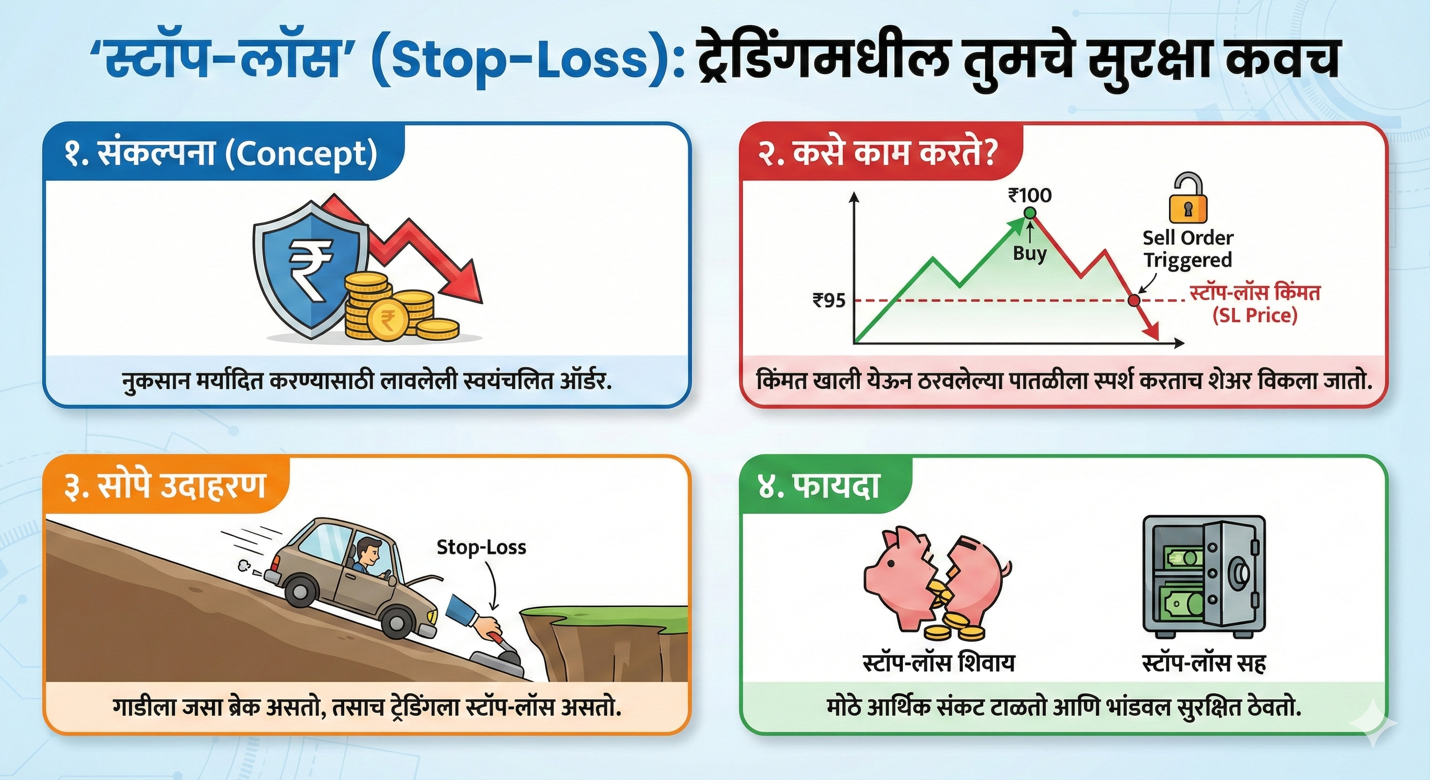 समजा, तुम्ही Tata Motors चा शेअर १००० रुपयांना घेतला आहे. तुम्हाला भीती आहे की भाव खाली पडू शकतो, म्हणून तुम्हाला ९९० रुपयांवर स्टॉप-लॉस लावायचा आहे. (म्हणजे १० रुपयांपेक्षा जास्त नुकसान नको).